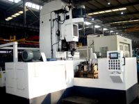 主減速器殼三軸鏜孔車端面機床,本機床是為粗加工、半精加工主減速器殼三孔及車削主減速器殼主錐端面而設(shè)計的專用機床。本機床采用立臥復(fù)合式三面結(jié)構(gòu),左右端各布滑臺和鏜頭,用于兩端孔的加工。立頭采用西德標準的DSS系列雙向刀盤鏜車頭,用于主錐端面孔加工,鏜車頭主電機采用變頻調(diào)速,以滿足鏜大小孔時切削速度的變化。中間采用數(shù)控滑臺,滑臺上安裝液壓夾具,以適應(yīng)不同品種的偏置距。